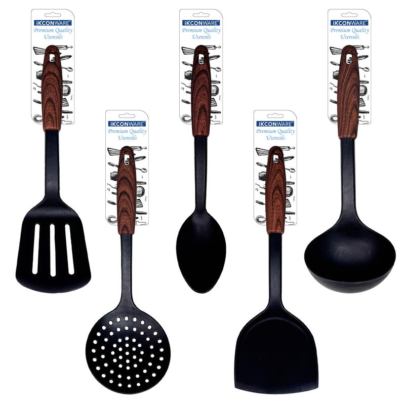 Unique Aesthetic: The combination of black tool heads and wood-grain PP handles creates a unique, stylish look that fits both modern and rustic kitchen decors.