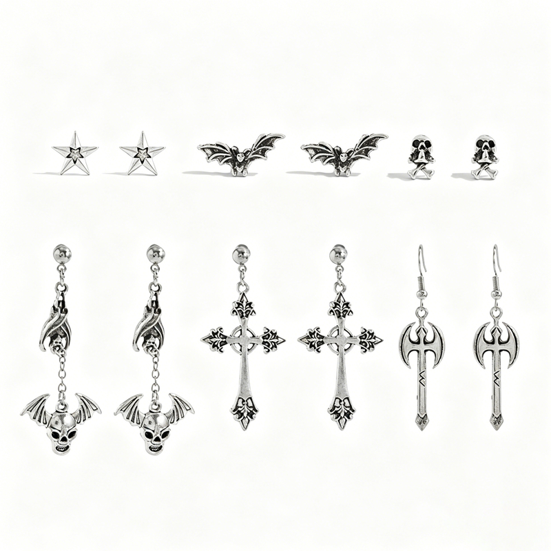 6-Pair Gothic Variety Set: Features 6 unique designs (star, bat, skull, cross, axe, winged skull) for mix-and-match gothic styling.