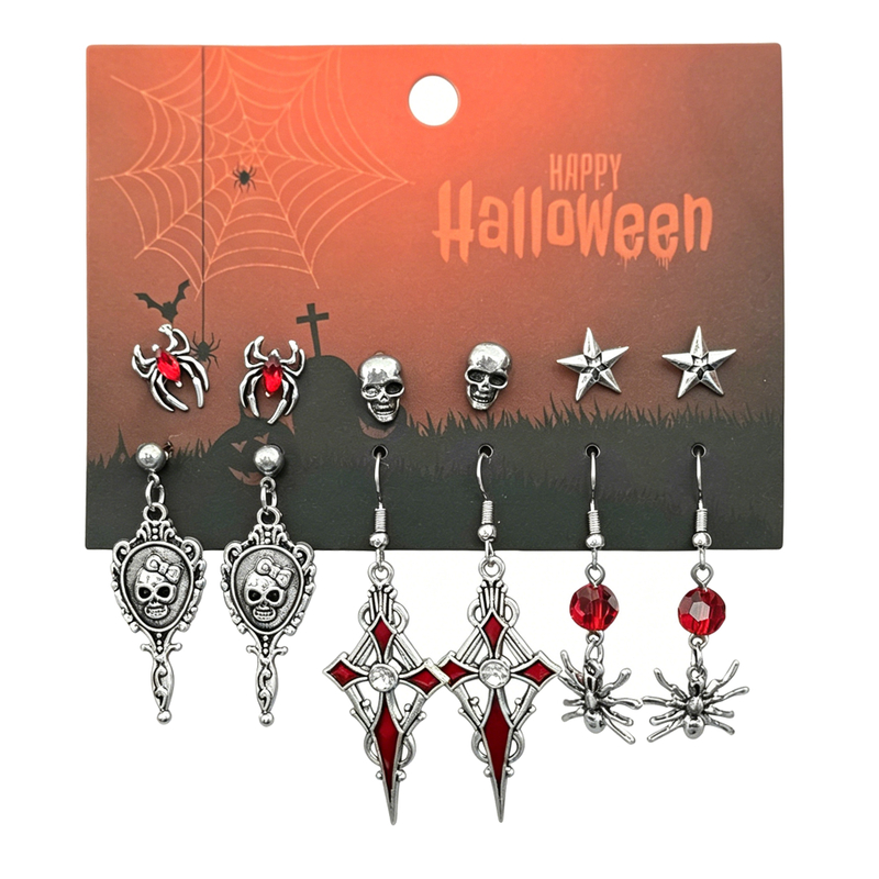 6 Pairs Versatile Gothic Set: Features spider, skull, cross, star designs, mix and match for diverse Halloween & edgy looks.