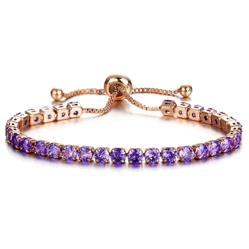 Luxury Tennis Bracelet Design: Lined with brilliant cushion-cut purple CZ stones, mimicking the luster of real amethyst for a high-end, timeless look.
