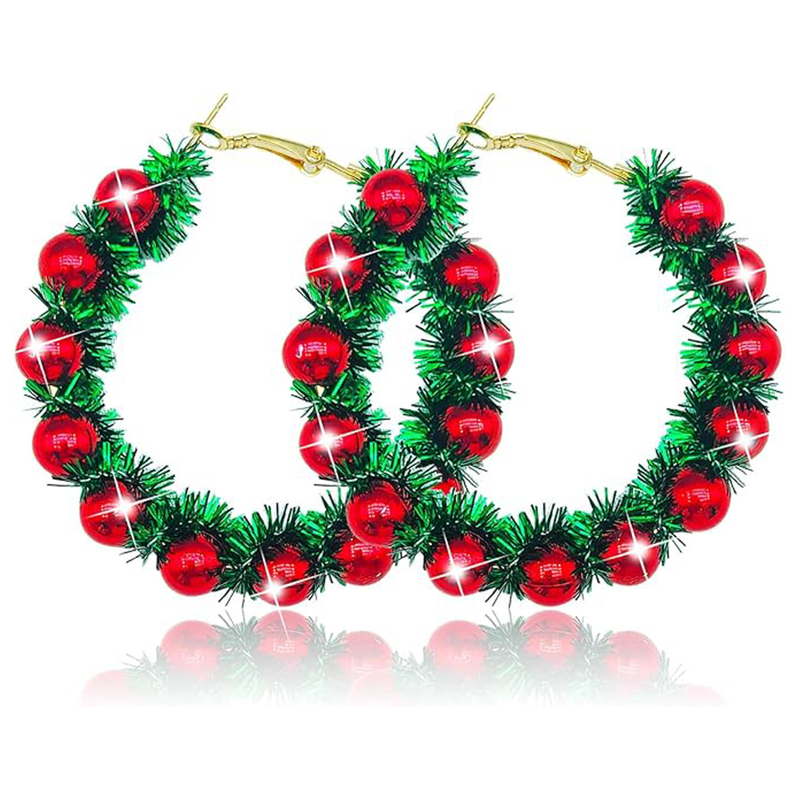 Festive Wreath Design: Inspired by Christmas wreaths, these hoop earrings feature shiny red balls and green tinsel, adding a fun and festive touch to your holiday look.