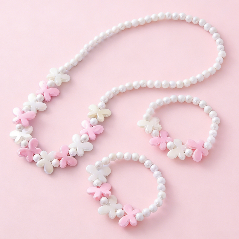 Adorable Butterfly Design: Features charming pink & white butterfly charms paired with creamy faux pearls, perfect for little girls' sweet princess style.