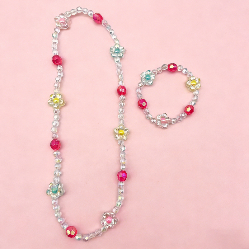 Adorable 2-Piece Jewelry Set: Includes 1 beaded necklace (40-55cm adjustable) and 1 matching beaded bracelet (14-20cm stretchy), decorated with colorful flower charms and shiny iridescent beads, perfect for little girls' dress-up play.