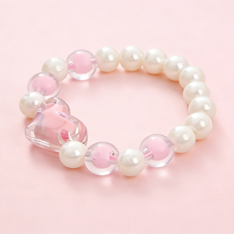 Adorable Pink Heart & Faux Pearl Design: This stretch bracelet features a large iridescent 3D heart charm with a pink center, paired with glossy white faux pearl beads and pink accent beads, creating a sweet, princess-like look that little girls will love.